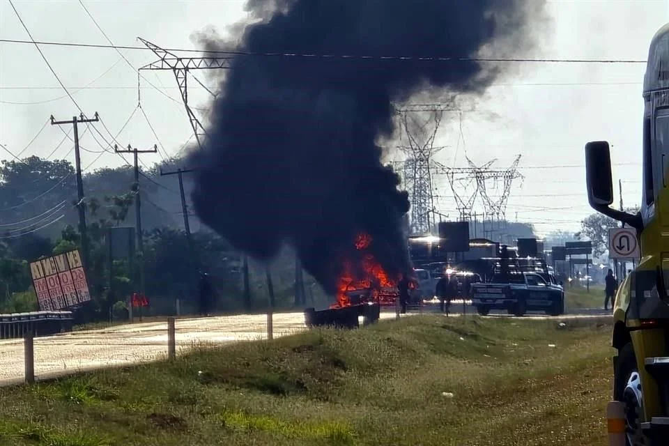 Villahermosa.- Vehículos fueron incendiados en la carretera federal Villahermosa-Cárdenas en Tabasco, tras la captura de un generador de violencia identificado como Adrián “N”, presunto integrante del grupo criminal “La Barredora”.