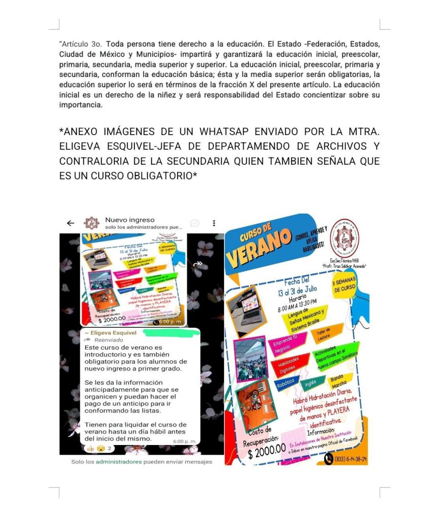 A través de un escrito dirigido a la jefa del CREDE Madero, Blanca Estela Carrazco Hernández, los inconformes señalaron que el director del plantel, Arturo Saavedra Torres, les informó que dicho curso es requisito indispensable para mantener la inscripción de sus hijos.