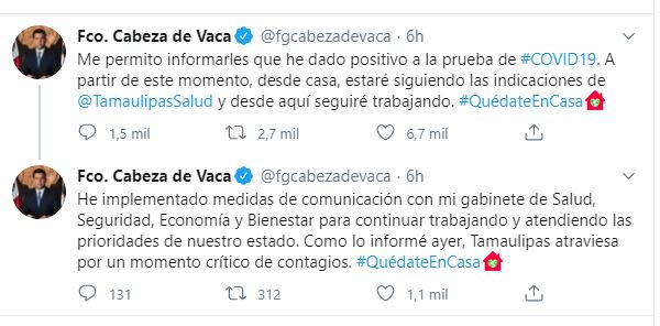 CIUDAD VICTORIA, TAM.- El gobernador de Tamaulipas, Francisco García Cabeza de Vaca, dio positivo a coronavirus.